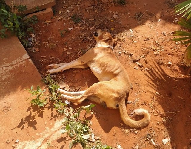 No imóvel dele foi encontrado um cachorro visivelmente doente, com as patas machucadas, magro, sem comida e água. O animal sequer conseguia se levantar.