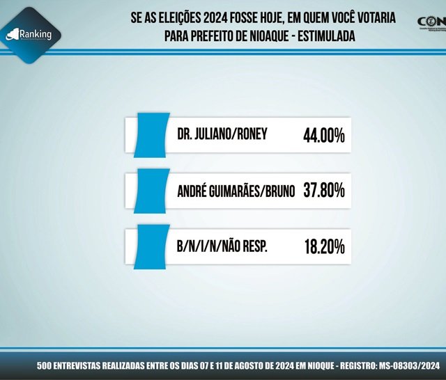 Pesquisa registrada no TSE (Tribunal Superior Eleitoral) sob o nº MS-08303/2024, encomendada pelo CNPJ: 03.955.300/0001-12, o Instituto Ranking Brasil Inteligência realizou, no período de 7 a 11 de agosto deste ano, junto a 500 moradores de Nioaque (MS), com 16 anos ou mais de idade, a segunda pesquisa de intenção de votos para a Prefeitura Municipal nas eleições 2024, tendo intervalo de confiança de 95% e uma margem de erro de 4,3%, para mais ou para menos.