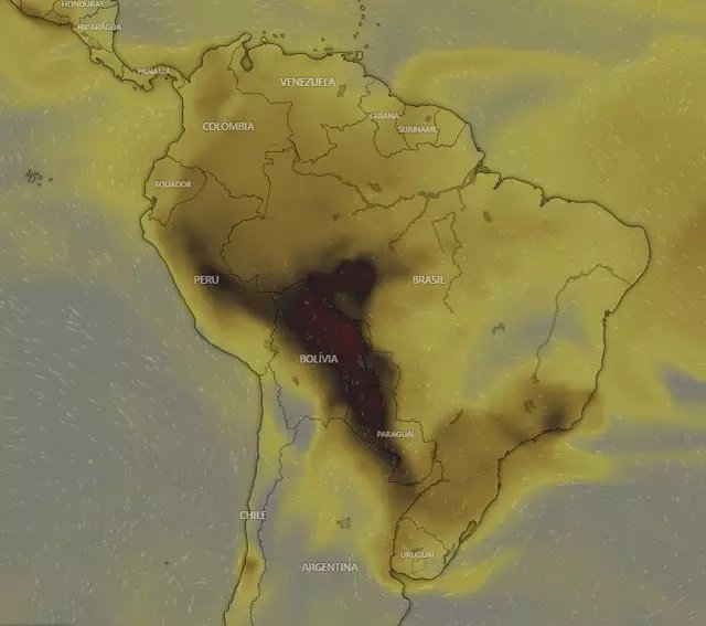 Incêndios florestais que ocorrem na Amazônia e no Pantanal estão prejudicando a respiração de milhões de brasileiros. A concentração do monóxido de carbono está sobre uma faixa que se estende do Norte do Brasil até as regiões Sul e Sudeste, passando sobre o Peru, Bolívia e Paraguai.