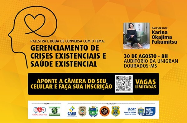 No próximo dia 30 de agosto, sexta-feira, o Centro de Atenção Biopsicossocial (CABS) da Secretaria de Estado de Justiça e Segurança Pública (Sejusp) dará início à programação do “Setembro Amarelo” em grande estilo. A partir das 8h da manhã, no auditório da Unigran, em Dourados, servidores, policiais e agentes da segurança pública de Mato Grosso do Sul estão convidados para participar da palestra e roda de conversa intitulada “Gerenciamento de Crises Existenciais e Saúde Existencial”. O evento é aberto a todos os profissionais da área, mediante inscrição prévia.