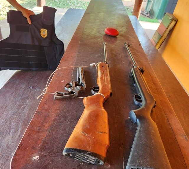 O mandado de busca e apreensão foi expedido após representação da Autoridade Policial considerando-se denúncia efetuada pela ex-convivente do suspeito. Durante as buscas, foram localizados: um revólver, calibre 22, desmontado, e duas espingardas. Ele, no entanto, não foi localizado.