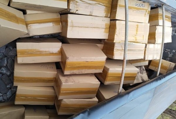 Os policiais fiscalizavam na BR-262, quando abordaram um caminhão VW/29.520. Durante a vistoria do veículo e da carga, foram encontradas várias caixas de papelão que eram diferentes da carga de ferro gusa, declarada pelo motorista.