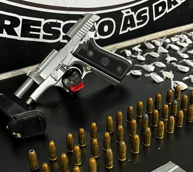 No endereço alvo das investigações foram apreendidas porções de cocaína e maconha, além de notas de dinheiro e uma pistola Taurus, calibre .380. Foram apreendidos também dois carregadores e 39 munições.