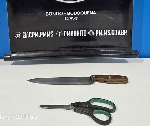 Durante as buscas na residência da vítima, foram localizadas uma tesoura de cabo preto e verde e uma faca de aproximadamente 33cm, sendo 22cm de lâmina e cabo de madeira, instrumentos utilizados pelo autor para ameaçar e lesionar a vítima de 27 anos.