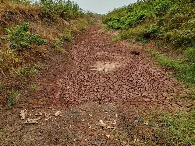 No distrito de Porto Esperança, à beira do Rio Paraguai, em Corumbá, o solo ressecado e rachado evidencia os efeitos da seca prolongada que atinge Mato Grosso do Sul e ainda irá se prolongar até outubro, mantendo o nível do rio abaixo das médias históricas.