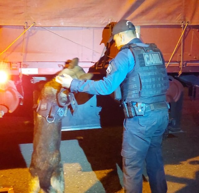 A equipe que promovia abordagem de veículos com a ajuda de cães policiais farejadores, K9 Cwiff e K9 Paco parou uma carreta com placa da Bolívia e durante vistoria na carga, um dos cachorros ficou em alerta ao passar próximo do compartimento utilizado para armazenamento de gêneros alimentícios.
