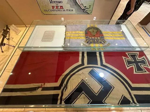 Além da bandeira nazista, há também outros troféus de guerra como as águias do ditador Mussolini e os itens que eles ganharam como a cobra em mármore, equipamentos que usavam na construção da ponte Bailey, medalhas e espadas. Segundo a museóloga, apesar do tempo decorrido a bandeira alemã está com avarias ínfimas para idade que tem.