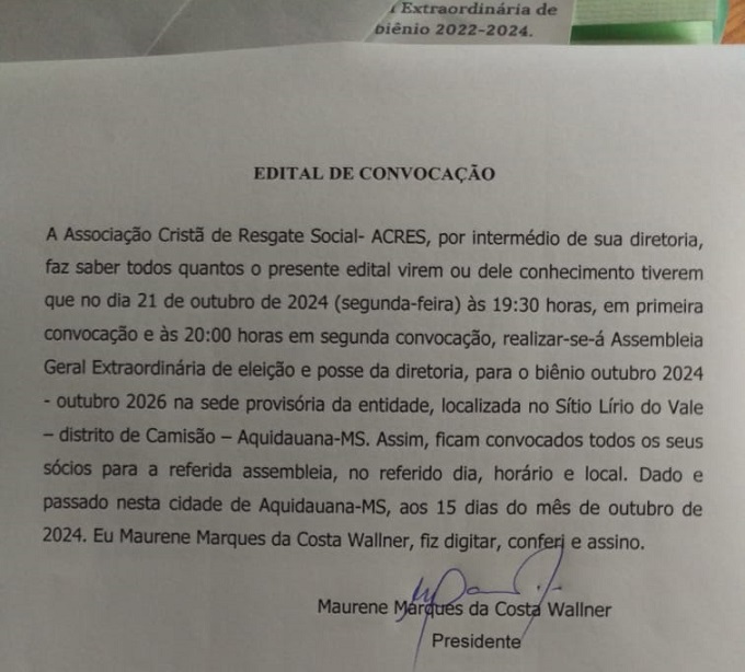 Entidade com sede no distrito de Camisão em Aquidauana é presidida por Maurene da Costa Wallner.