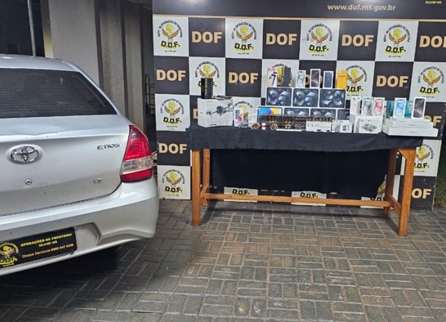 Policiais militares do DOF (Departamento de Operações de Fronteira) apreenderam na quinta-feira (24), em Maracaju, um veículo Toyota Etios carregado com mais de R$ 340 mil em materiais de contrabando e descaminho. Entre os produtos apreendidos estão remédios e anabolizantes. Dois homens de 25 e 46 anos foram detidos.