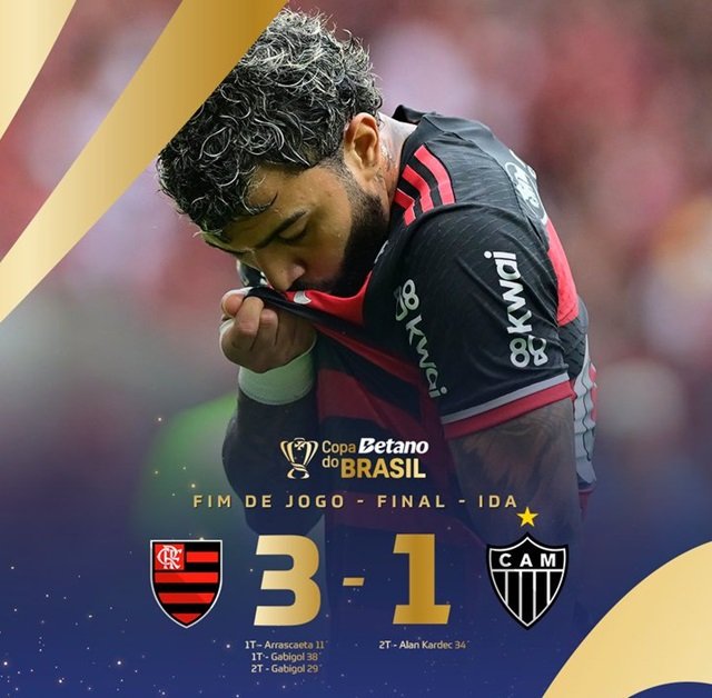 O Flamengo levou a melhor sobre o Atlético-MG com vitória por 3 a 1 no primeiro jogo da final da Copa do Brasil no Maracanã. Arrascaeta abriu o placar e Gabigol marcou duas vezes para o Flamengo. Alan Kardec diminuiu para os mineiros nos minutos finais.