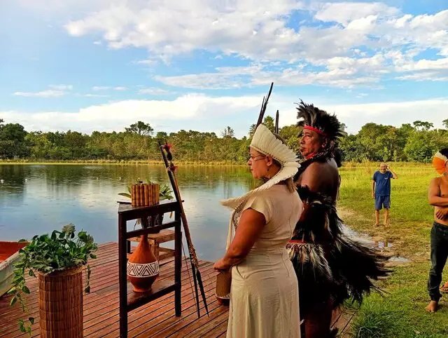 A cerimônia foi feita em um altar decorado com vasos da etnia Terena, à beira do lago da propriedade do Retiro Paixão, no pôr do sol, e começou com a entrada do noivo, acompanhado pelos homens, com a dança Korró.