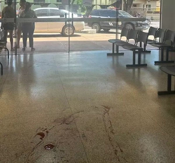 Poças de sangue na recepção do posto de saúde onde médico foi esfaqueado e morreu (Foto: Direto das Ruas)