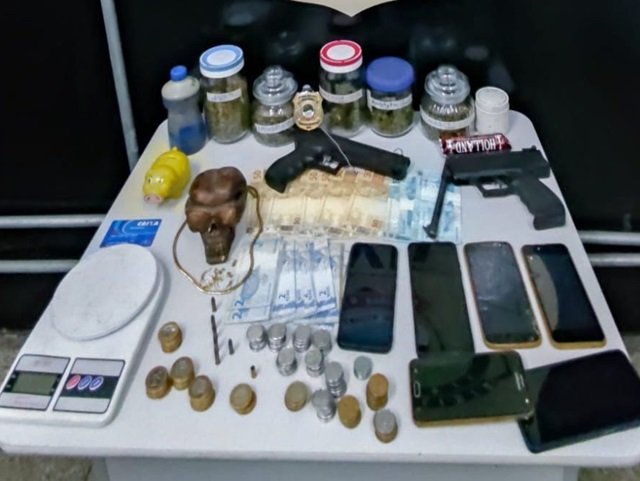 Diante da situação flagrancial, os agentes ingressaram no imóvel, onde localizaram uma quantidade significativa de drogas, armas de fogo, dinheiro em espécie, celulares, além de simulacros de arma. Apesar da vasta apreensão, nenhum suspeito foi encontrado no local, sugerindo que os responsáveis tenham fugido antes da chegada da polícia.