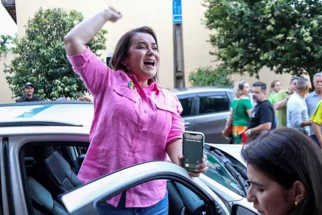 Prefeita Adriane Lopes vibrando após o resultado das urnas neste ano, ao sair de casa (Foto: Arquivo/Henrique Kawaminami).