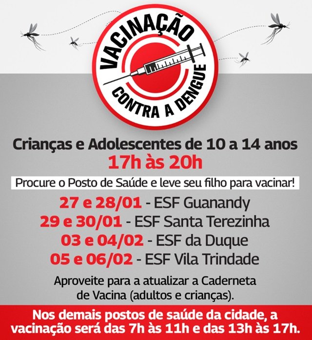 Observação: nos demais postos de saúde, a vacinação será realizada no horário de funcionamento básico de cada unidade.