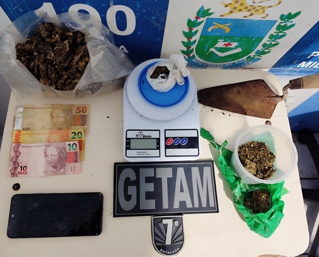 Com apoio da Rádio Patrulha 2, a equipe realizou buscas no local e encontrou um pote contendo 21 gramas de maconha prensada, uma porção de 52 gramas da mesma substância e um embrulho enterrado com 400 gramas de maconha tipo skunk. Também foram apreendidos uma balança de precisão e uma colher de pedreiro, utilizada para enterrar os entorpecentes.