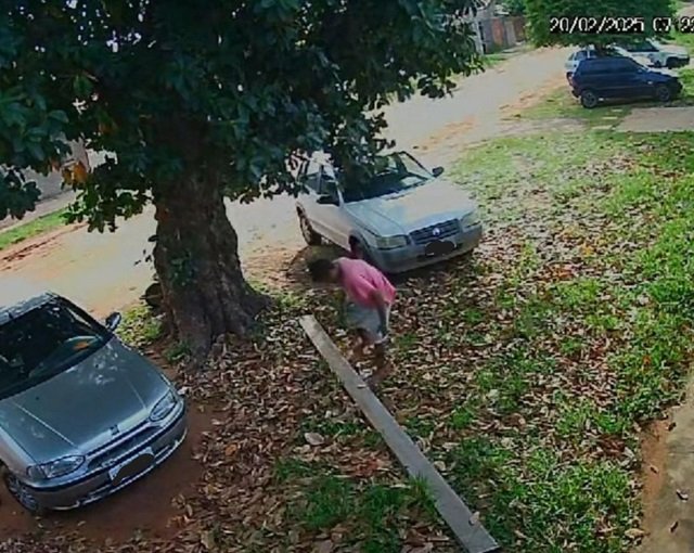 O flagra ocorreu na quinta-feira (20). Imagens do circuito de segurança mostram que pela madrugada, o bandido chega no local, pega uma viga e coloca embaixo de um pé de jaca.