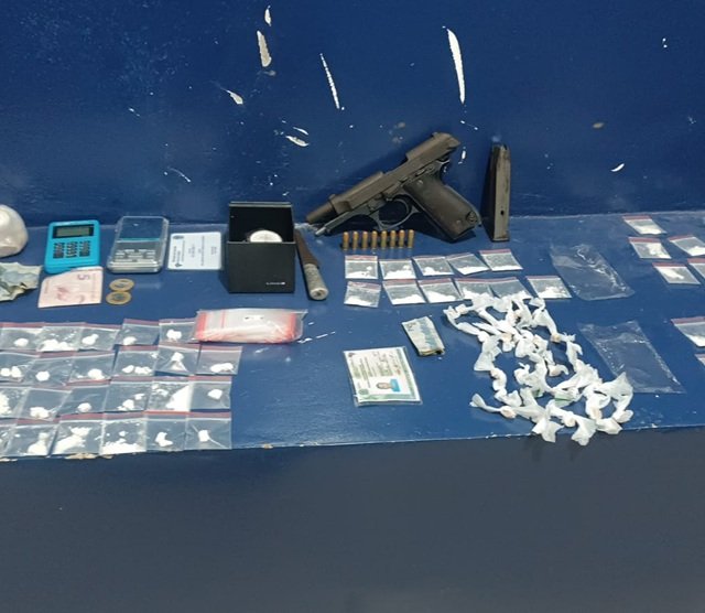 Também foram encontrados uma pistola Taurus calibre 7.65 com oito munições, uma balança de precisão com vestígios de droga, R$ 11 em dinheiro, uma máquina de cartão e 139 sacos plásticos utilizados para embalar os entorpecentes.