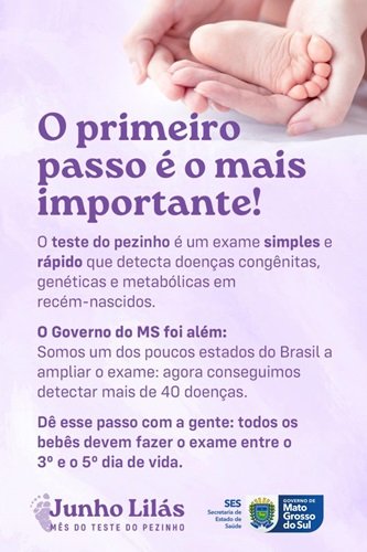 Por isso, a campanha convoca todas as famílias sul-mato-grossenses a priorizarem a realização do teste do pezinho dentro do prazo indicado, garantindo que seus filhos recebam o cuidado e a atenção que merecem desde os primeiros dias de vida.