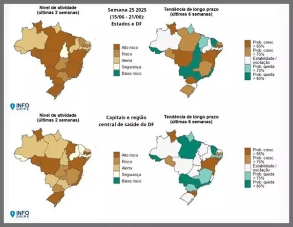 Apesar da melhora em parte do país, o cenário nacional ainda requer atenção. A Fiocruz identificou que 12 estados seguem em situação de alerta, risco ou alto risco, com tendência de crescimento no longo prazo. Entre eles estão Mato Grosso, Minas Gerais, Paraná, Bahia, Alagoas, Pará, Rondônia e Rio Grande do Sul. Nesses locais, a alta de casos é sustentada principalmente pela circulação da influenza A e do VSR.