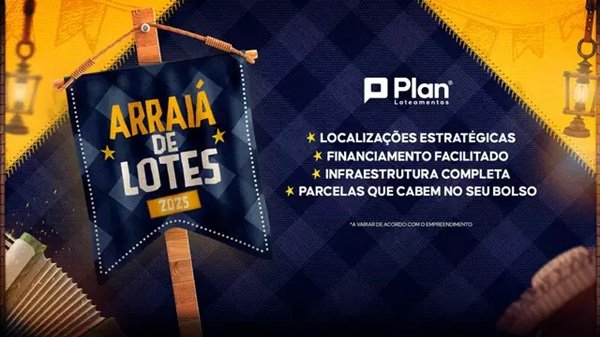 O Arraiá de Lotes da Plan Loteamentos está chegando ao fim, mas ainda dá tempo de conquistar o seu terreno e realizar o sonho da casa própria pagando a entrada somente em 2027! Ah, e com parcelas pequenas, que cabem no bolso!