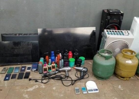 Entre os itens encontrados estavam 13 aparelhos celulares sem nota fiscal, cinco televisores, dois aparelhos de ar-condicionado, botijões de gás, alto-falantes, uma caixa de som e munição de arma de fogo.