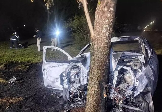 Alan Silva Santos, de 31 anos, morreu e uma criança foi socorrida depois de o carro que ocupavam bater em uma árvore e pegar fogo, no prolongamento da Avenida Marcelino Pires, em Dourados. O acidente aconteceu na madrugada desta segunda-feira (14).