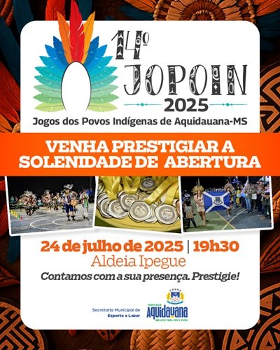 A Prefeitura de Aquidauana, por meio das Secretarias Municipais de Esporte e Lazer e de Educação, realiza entre os dias 24 e 26 de julho a 14ª edição dos Jogos dos Povos Indígenas de Aquidauana (JOPOIN).