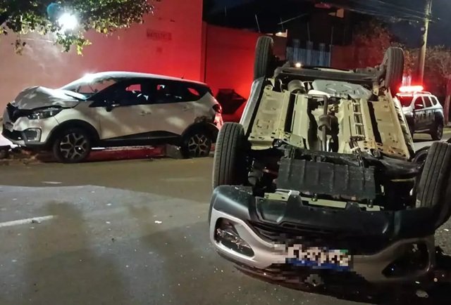 Um Renault Kwid de cor prata capotou ao bater em dois veículos na noite de ontem, sexta-feira (15), no Jardim São Lourenço, em Campo Grande.