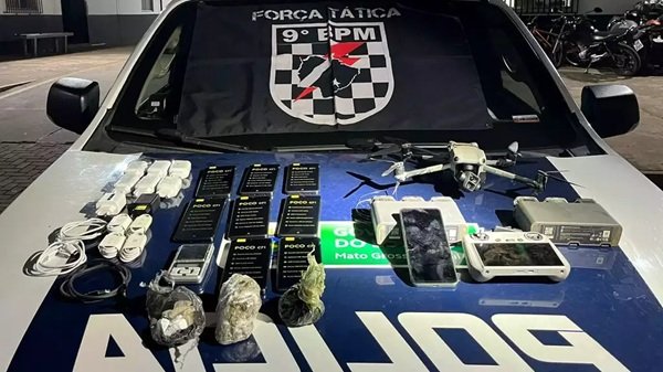 No local, foram apreendidos o drone, o controle remoto e uma caixa com oito celulares, baterias, carregadores, fios de náilon, balança de precisão, além de 166 gramas de maconha e 40 gramas de cocaína. Segundo relato da dupla, eles recebiam cerca de R$ 500 por viagem e chegavam a realizar até seis lançamentos por noite, a mando de um preso que monitorava a ação em tempo real pelo WhatsApp.