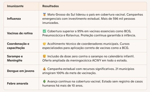 Além da liderança geral, MS vem apresentando resultados expressivos em diversas frentes. Em maio deste ano, o estado liderou a vacinação contra Influenza, com mais de 596 mil pessoas imunizadas. Na ocasião, considerando as gestantes, crianças e idosos, que integram o grupo prioritário, Mato Grosso do Sul obteve o primeiro lugar com 38,93% de imunização.