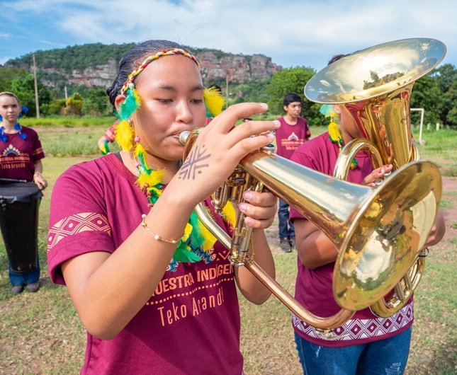 Na batida da caixinha e do bumbo, no som dos pratos, no sopro dos trombones e da tuba, no balanço do pandeiro e do chocalho... Indígenas terenas, afro-indígenas e estudantes da rede pública de Anastácio e Aquidauana (MS) dão o tom da melodia dos sonhos na Orquestra Indígena Teko Arandú, do Instituto RessoArte. Completando 12 anos em 2025, a orquestra se apresenta neste sábado (13), às 10h30, no II Encontro de Bandas e Fanfarras Indígenas do Estado de MS – ´Nzopúne´, no Ginásio de Esportes da Aldeia Cachoeirinha, em Miranda.