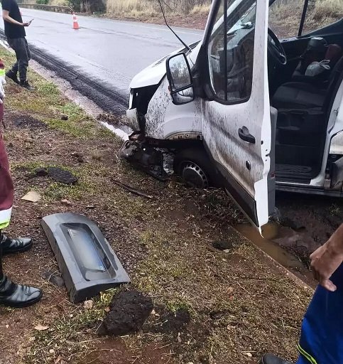 Na imagem enviada pelo leitor, é possível ver que, com o acidente, a van chegou a perder a placa. Em outro registro, é possível notar que os pneus do veículo furaram e o teto do veículo ficou completamente amassado.