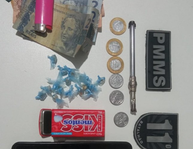 O objeto foi localizado e, ao ser aberto, foram encontrados 16 papelotes de substância análoga ao crack, além de R$ 50,00 em espécie.