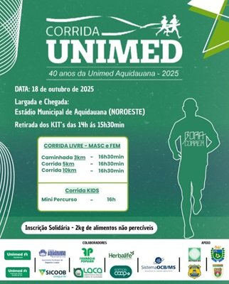Dentro desse contexto, a Prefeitura de Aquidauana, por meio da Secretaria Municipal de Esporte e Lazer, em parceria com a Unimed, vai realizar no próximo dia 18 de outubro, a Corrida 40 anos da Unimed em Aquidauana, nas categorias livre masculino e feminino, com largada e chegada no Estádio Municipal Mário Pinto.