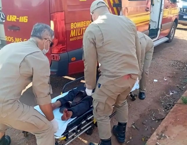 Vítima sendo socorrida por equipe do Corpo de Bombeiros (Foto: Vale do Ivinhema)