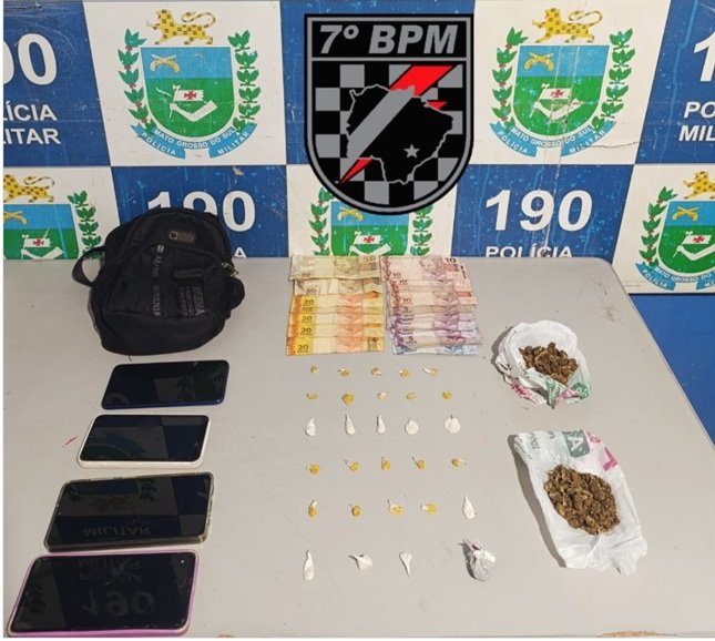 Durante a abordagem, os policiais encontraram porções de substância análoga à pasta base de cocaína e maconha, além de dinheiro em espécie e aparelhos celulares que, segundo a polícia, eram utilizados para facilitar o tráfico.