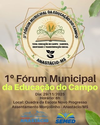 A Administração Municipal, por meio da Secretaria de Educação, convida para participar do 1º Fórum Municipal da Educação do Campo, um espaço de diálogo, troca de experiências e valorização dos saberes que nascem e florescem no campo.