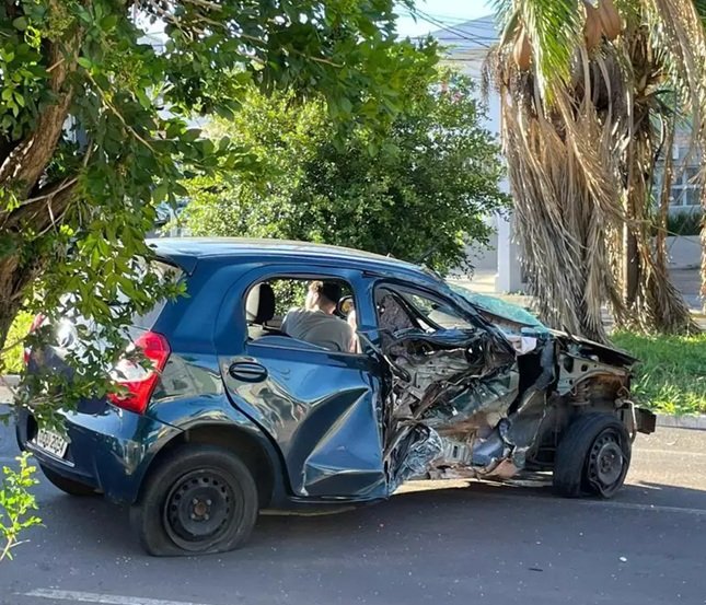A empresária Maria Luiza Pimenta, de 56 anos, contou ao Campo Grande News que viu o acidente e imediatamente acionou o Corpo de Bombeiros. “Eu vi a ‘super porrada’, coisas voando”. A parte dianteira direita do veículo ficou totalmente destruída.