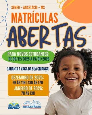 A Secretaria Municipal de Educação de Anastácio - Semed informa que estão abertas as matrículas para novos estudantes da rede municipal de ensino.