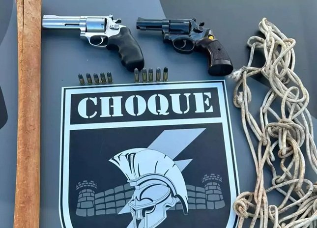 Uma das armas foi encontrada sob uma cômoda dentro da residência. A outra estava escondida na vegetação, próxima à caminhonete Amarok, coberta por um pano. Um dos envolvidos assumiu a posse de um dos revólveres.