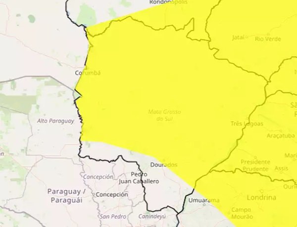 O Inmet (Instituto Nacional de Meteorologia) emitiu aviso de tempestade com grau de severidade de perigo potencial, já em vigor, e válido até 23h59. O aviso cobre praticamente todo o Estado, incluindo Campo Grande e outros 65 municípios.