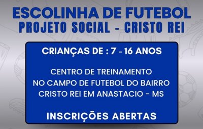 A Escolinha de Futebol – Projeto Social Cristo Rei está com inscrições abertas para crianças e adolescentes com idades entre 7 e 16 anos, em Anastácio, município de Mato Grosso do Sul.