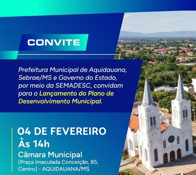 No dia 4 de fevereiro, a partir das 14h, será lançado o Plano de Desenvolvimento Municipal (PDM) de Aquidauana. A iniciativa é conjunta da Prefeitura de Aquidauana, Sebrae/MS, Governo do Estado, por meio da Secretaria de Estado de Meio Ambiente, Desenvolvimento, Ciência, Tecnologia e Inovação (Semadesc), e Prefeitura Municipal.