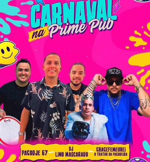 A Prime Pub realiza, nesta sexta-feira (13), uma noite especial de Carnaval, com programação musical e promoções para o público. O evento contará com shows do Grupo Pagodje 67, Gragefe Meu Rey e do DJ Lino Mascarado, garantindo diversidade de ritmos e animação durante toda a noite.