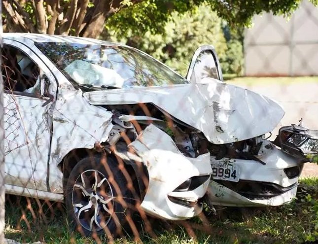 A vítima conduzia um Fiat Cronos branco quando perdeu o controle da direção em uma curva. O veículo invadiu a contramão, subiu na calçada, atravessou a cerca de arame e entrou na área da empresa. O impacto foi forte e o airbag do carro foi acionado, além disso, o para-choque também ficou bastante danificado.