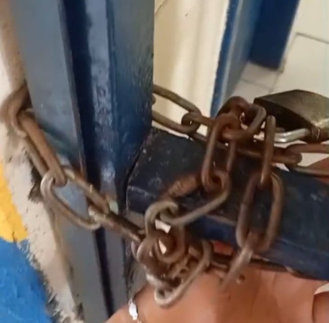 O portão da escola atualmente está com dois cadeados, um pelo lado de dentro e outro pelo lado de fora.