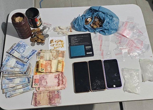 Durante as buscas, os policiais encontraram no interior da residência porções de droga do tipo pasta base, uma balança de precisão, diversos envelopes plásticos utilizados para embalar entorpecentes destinados à comercialização, além de dinheiro em espécie e aparelhos celulares.
