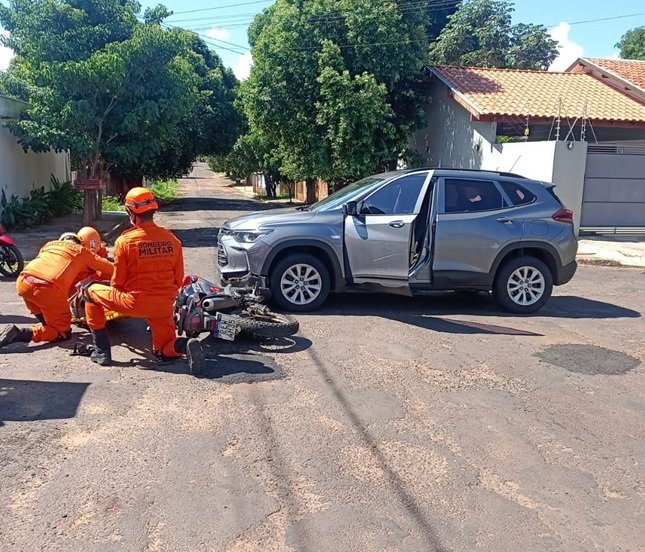 No início da tarde desta sexta-feira (10), o Corpo de Bombeiros Militar de Mato Grosso do Sul atendeu a um sinistro de trânsito no Bairro Alto, em Aquidauana. O acidente ocorreu no cruzamento das ruas José Alves Correia e Lourdes Nemer de Arruda e envolveu um carro e uma motocicleta.