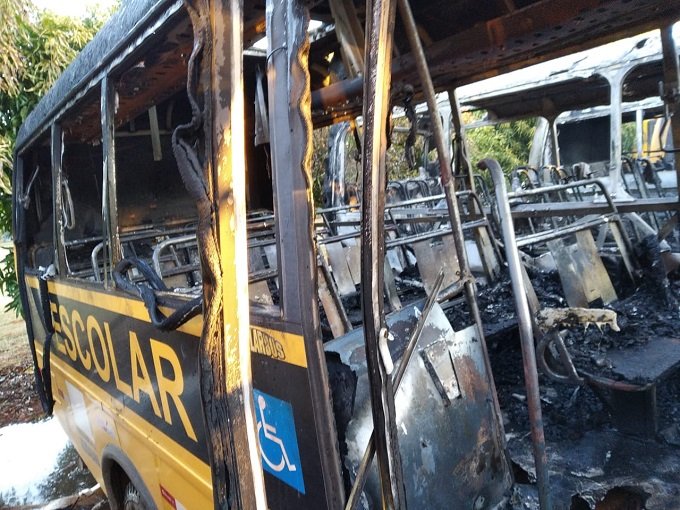 Ônibus escolares que estavam na garagem da Prefeitura de Aquidauana na Vila Santa Terezinha destruidos por um incêndio nesta madrugada de domingo.
